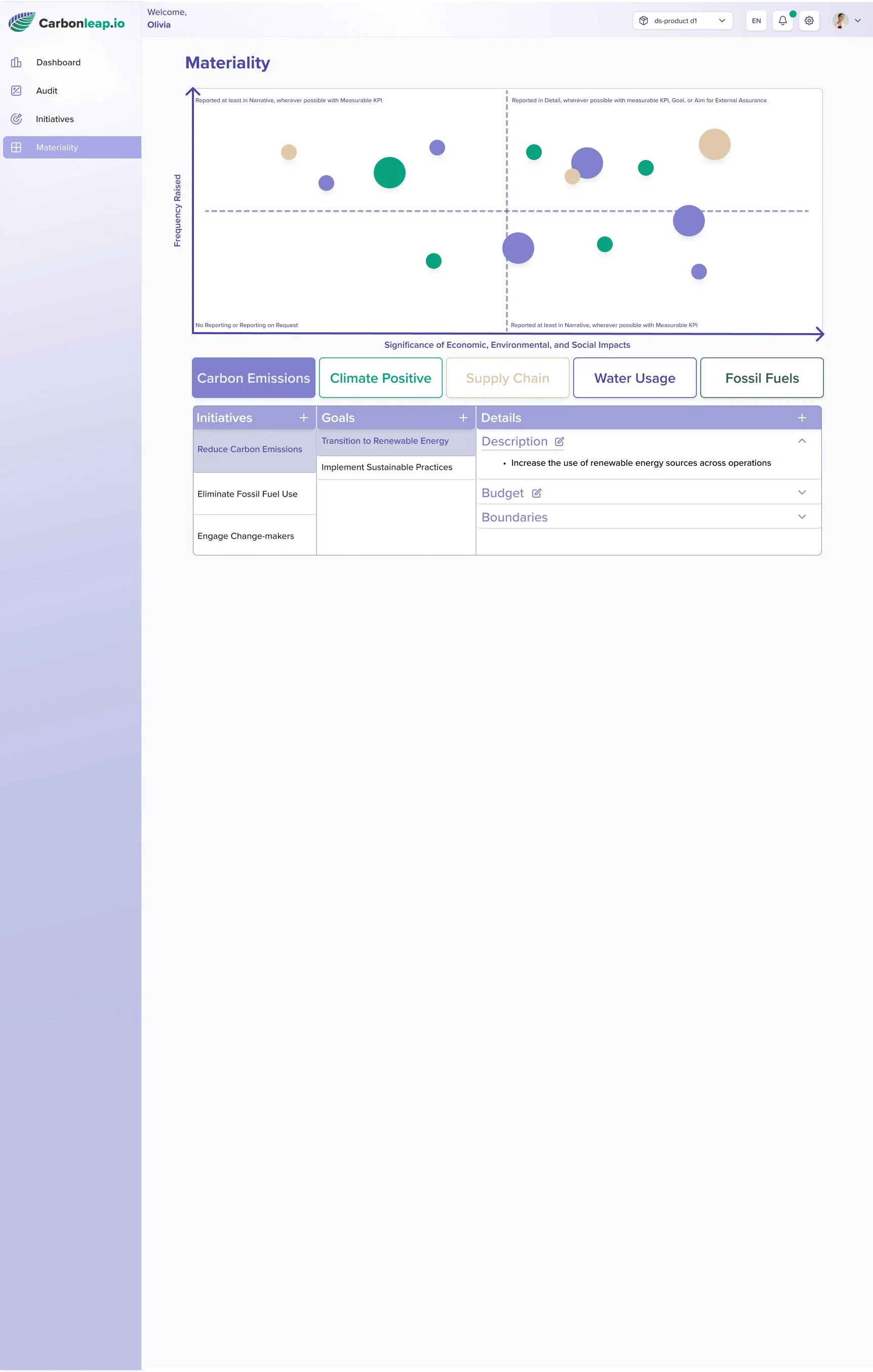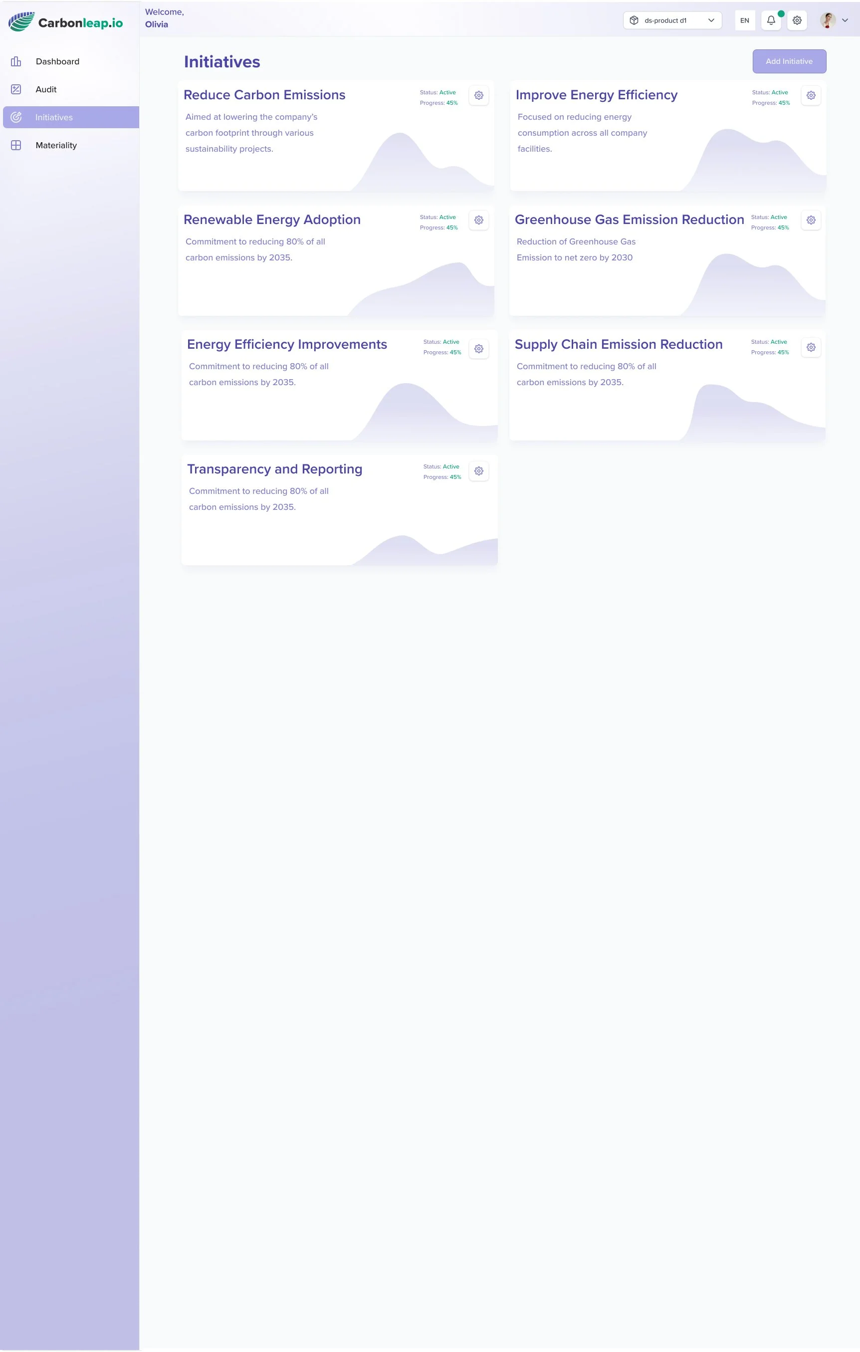 Carbon Leap is a startup Software as Service that informs companies about their carbon emissions, and allows users to assign initiatives and goals in order to track and reduce such emissions. I designed the main dashboard pages for users to view their emission data and goals/initiatives.
